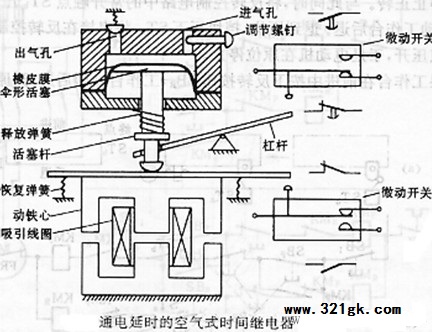 空气阻尼式时间继电器,既具有由空气室中的气动机构带动的延时触点,也具有由电磁机构直接带动的瞬动触点,可以做成通电延时型,也可做成断电延时型。电磁机构可以是直流的,也可以是交流的。