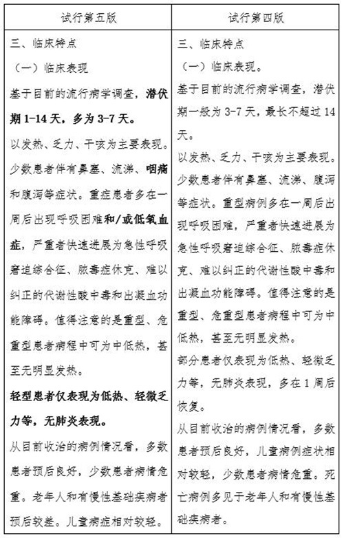 国家卫健委医政医管局5日于官网发布《关于印发新型冠状病毒感染的肺炎诊疗方案(试行第五版)的通知》(以下简称“通知”)称,为进一步做好新型冠状病毒感染的肺炎病例诊断和医疗救治工作,国家卫健委组织专家在对前期医疗救治工作进行分析、研判、总结的基础上,对诊疗方案进行修订,形成了《新型冠状病毒感染的肺炎诊疗方案(试行第五版)》。 ![]() 通知强调,各有关医疗机构要在医疗救治工作中积极发挥中医药作用,加强中西医结合,建立中西医联合会诊制度,促进医疗救治取得良好效果。 另据国家卫健委发布的《新型冠状病毒感染的肺炎诊疗方案(试行第五版)解读》显示,相较于《新型冠状病毒感染的肺炎诊疗方案(试行第四版)》,试行第五版进行了多处完善,部分修改如下: 第一,流行病学特点。传染源改为“目前所见传染源主要是新型冠状病毒感染的患者。无症状感染者也可能成为传染源。” ![]() 第二,临床表现。潜伏期1-14天,一般为3-7天。以发热、乏力、干咳为主要表现。少数患者伴有鼻塞、流涕、腹泻等症状。因部分重症患者无明显呼吸困难,表现为低氧血症,改为“重症患者多在发病一周后出现呼吸困难和/或低氧血症,严重者快速进展为急性呼吸窘迫综合征、脓毒症休克、难以纠正的代谢性酸中毒和出凝血功能障碍等。”强调“轻型患者仅表现为低热、轻微乏力等,无肺炎表现。” ![]() 第三,抗病毒治疗方面指出,目前没有确认有效的抗病毒治疗方法。 ![]() 第四,对于严重ARDS患者,建议进行肺复张。在人力资源充足的情况下,每天应进行12小时以上的俯卧位通气。俯卧位通气效果不佳者,如条件允许,应尽快考虑体外膜肺氧合(ECMO)。 ![]() 第五,解除隔离和出院标准。在“体温恢复正常3天以上、呼吸道症状明显好转”基础上,增加“肺部影像学显示炎症明显吸收”,连续两次呼吸道病原核酸检测阴性(采样时间间隔至少1天),可解除隔离出院或根据病情转至相应科室治疗其他疾病。 ![]() |