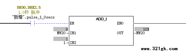 3、通过用ADD_I指令来实现计时,将之前做的每隔一秒钟导通的上升沿作为使能,每隔1S中自加1一次,来实现计时