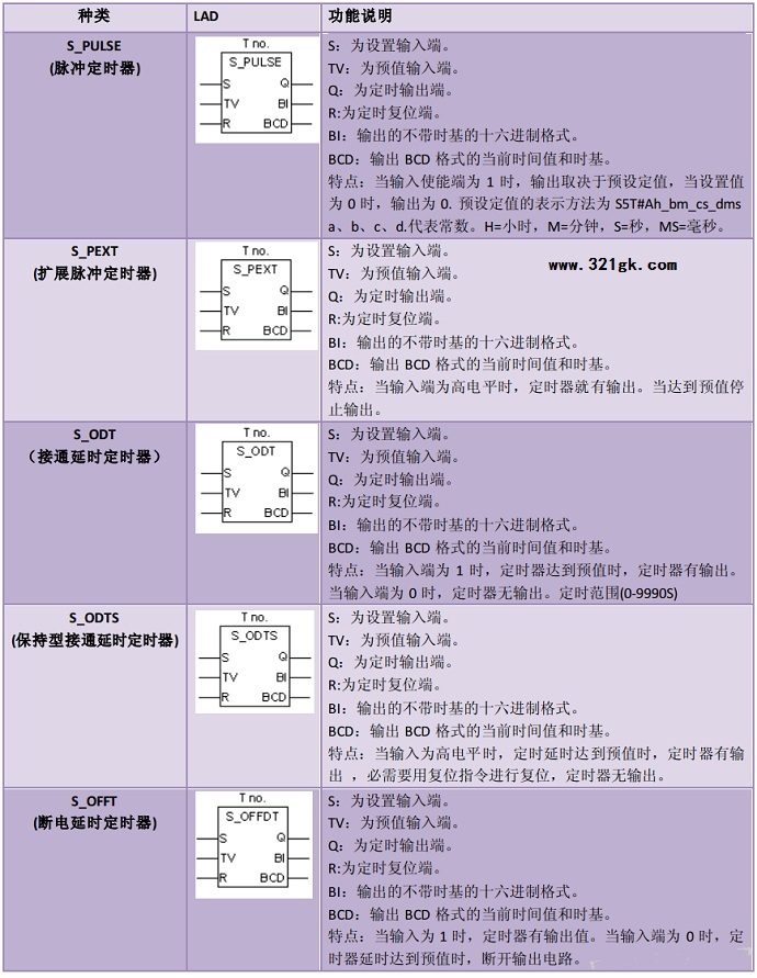 定时器的地址是16位的,地址范围为T0—T255,计时的时间范围为1—9990S。如果内部的256个定时不能达到系统设计的要求的话,可以通过自行设计来代替定时器,方法1利用OB35,方法2利用CPU内部时钟脉冲。