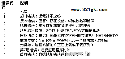 1 网络读写(NETR/NETW)指令介绍网络读写指令一般用于S7-200 CPU之间的PPI网络通信。PPI通信前要保证PPI网络上的所有站点都应当有各自不同的网络地址,否则通信不会正常进行。另外,网络读写指令进行编程和应用时要注意以下几点:1) 在程序中可以使用任意条网络读写指令,但是在同一时刻,最多只能有8条网络读写指令被激活; 2) 每条网络读写指令可以从远程站点读取/写入最多16个字节的信息; 3) 使用NETR/NETW指令向导可以编辑最多24条网络读写指令,其核心是使用顺序控制指令,这样在任一时刻只有一条NETR/NETW指令有效; 4) 每个CPU的端口只能配置一个网络读写指令向导。 2 网络读写指令向导组态2.1 硬件连接下面通过一个实例(两台S7-200 plc之间的通信)来介绍如何使用网络读写指令向导。首先,两个S7-200之间的硬件连接需要一根标准DP电缆加两个DP总线插头。两台S7-200的RS485通信端口连接方式,可参考以下图片中的连接方式(如果PLC有两个通信端口,则任意端口都可进行配置,本例中两个PLC均以Port 0口做PPI通信使用),如图1所示。![]() 图1 两台PLC的网络连接 2.2 NETR/NETW向导组态过程2.2.1设定通信站地址首先,用PC/PPI编程电缆将两台PLC的网络站地址分别设置为2和3,波特率都为9.6Kbps。这时,将编程电缆连接到任一个CPU带可编程插口的DP插头上,查找两台PLC的站地址,如图2所示。![]() 图2 设定两台CPU的网络地址 在本例中,选定通信地址为3的PLC为网络主站,并对其进行向导配置。选定要做为通信主站的CPU地址,点击确认后即可进入该CPU的编程界面。另外,网络读写指令向导会自动将CPU设置成主站模式,不必另行编程设置,只需为主站编写通信程序,从站直接使用通信缓冲区中的数据,或将数据整理到通信区即可。 2.2.2 向导配置步骤进入到编程画面后,点击工具菜单栏,找到指令向导选项,准备进入网络读/写功能的向导配置模式,如图3所示。 图3 进入指令向导编程界面 打开指令向导界面,选择NETR/NETW指令功能,如图4所示。 图4 NETR/NETW指令向导界面 选择网络读写指令后,点击下一步,可以定义通信所需网络操作的数目,如图5所示。向导中最多可以使用24个网络读写操作,对于更多的操作,可用网络读写指令编程实现,本例子中将建立两个网络操作。 图5 网络读写操作数目的确定 接下来,选择要进行通讯主站的PLC端口序号,这里选择PORT 0口作为通讯主站端口,并为即将生成的向导配置子程序命名(可使用默认名,也可自命名)。对于有两个通信端口的CPU既可以选择Port 0也可以选择Port 1,所有网络操作将由定义的通信口完成,如图6所示。 ![]() 图 6 定义网络端口序号并命名子程序名称 点击下一步,进入到数据交换区域的设定界面,如图7所示。 图7 网络读数据交换组态界面 其中: 1. 代表定义该网络操作是一个网络读(NETR)还是一个网络写(NETW)操作; 2. 代表定义应该从远程PLC读取多少个数据字节(NETR)或者应该写到远程PLC多少个数据字节(NETW),每条网络读写指令最多可以发送或接收16个字节的数据; 3. 代表定义想要通信的远程PLC地址; 4. 代表定义的是网络读(NETR)或网络写(NETW)操作时,定义读取或写入的数据应该存在本地PLC的哪个地址区,并且将被写入和被读取的数据定义在远程PLC中的哪个地址区,有效的操作数为VB、IB、QB、MB、LB; 因为之前已定义了两项网络读/写操作,所以在“下一项操作”中可以配置另外一条网络读/写操作指令,配置内容与上述界面类似,就不再重复介绍。在第一个操作中定义为网络读操作,地址分配如图7所示;下一项操作中将定义为网络写(NETW)操作,具体的地址分配如图8中所示的内容。 图8 网络写操作的配置画面 最后需要分配V存储区的建议地址,建议将V存储区起始地址设置的大一些(如图9所示),原则是避免和程序中已经应用到的V存储区地址有重叠。 ![]() 图9 建议地址区分配 完成了上述步骤,即完成了向导的配置过程。在向导配置完成后,会自动生成网络读写指令的子程序及符号表。 2.3 NETR/NETW程序块编程完成向导配置后,进入程序块编程。编程的内容就是对向导生成的子程序进行调用,最后将程序下载到相应的PLC中,使之生效,如图10所示。![]() 图10 调用向导生成的子程序模块 其中: 1) 必须用SM0.0来使能NETR/NETW,以保证该指令的正常运行; 2) Timeout:超时参数。0=不延时;1-32767=表示以秒为单位的超时延时时间。如果通信有问题的时间超出此延时时间,则报错误; 3) Cycle:周期参数。此参数在每次所有网络读写操作完成时切换其开关量状态; 4) Error:错误参数。0=无错误,1=有错误。 2.4 通信数据交换首先,打开主站CPU222的状态表,输入数据的交换地址区,并在执行NETW指令的VB200~VB201区域赋值,然后在通信的界面中选择从站CPU 224XP,并打开它的状态表进行监控,查看它的VB200和VB201是否有值写入,同时在VB100和VB101中写入新数值,然后打开主站CPU222的状态表监控相应的地址区是否接收到数值,由此完成如图11所示的读/写数据交换过程。![]() 图11 主/从站通信数据交换 3 通信错误代码如果数据区没有接收到数据,那么代表通信不成功,需要查看通信的状态字节来获取错误代码。每项读/写操作的状态字节可以参考指令向导配置成功后在符号表中生成的NET_SYMS标签栏,如图12所示。状态字节对应的V区地址如图13所示(由于分配的V存储区起始地址不同,那么得到的状态字节地址也会不同),例如:第一项NETR操作对应