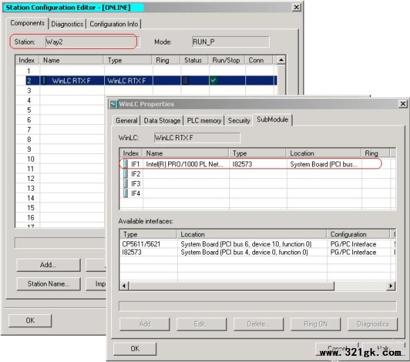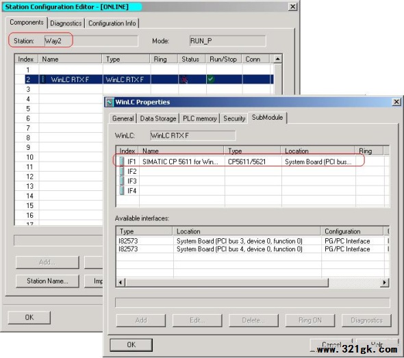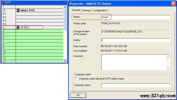 如图2所示,有一台安装有WinAC RTX和Step 7的SIEMENS 工控机,组态PC站名称为Way1。 图2 通过双击桌面上的站组态管理器快捷方式或双击系统托盘上的小电脑图标打开站组态管理器。查看“站组态管理器Station Configuration Editor”中PC站的属性,并将其设置为Way1,与硬件组态中名称一致,如图3所示。