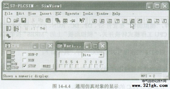 ![]() 图中自左向右,对应按钮所打开的仿真对象依次为:输入(Input Variable)、输出(Output Variable)、标志寄存器(M)、定时器(T)、计数器(C)、通用变量(Generic Variable)、垂直显示的位变量(Vertical Bit)、堆栈寄存器(Nesting Stacks)、CPU累加器(CPU Accumulators;包括状态寄存器与变址寄存器)、块寄存器(Block Registers)。 点击相应的“仿真对象选择”快捷按钮,可以出现仿真对象显示区(见图14-4.3)。 ![]() 在仿真对象显示区,可以输入并选择对象的地址、显示形式,显示形式可以采用位、二进制数据、十进制数据、十六进制数据、字符及字符串等。 对于定时器和计数器,还可以在显示对象中直接进行实际值的修改,并监视其运行过程,或者在运行过程时直接对其进行复位处理。 在通用变量(Generic Variable)的仿真对象显示页面为通用对象显示区,S7-PLCSIM不指定具体的显示对象,操作者可以在地址区输入相应的地址进行对象选择(见图14-4.4)。例如,当地址区域输入了IBO后,即显示仿真对象I0.0~0.7,其效果与直接选择“输入”作为仿真对象完全相同,因此,这是一个通用、灵活的显示对象选择区。 ![]() 垂直显示的位变量(Vertical Bit)对象也是一个通用的对象显示区,操作者可以在地址区输入相应的地址进行对象选择,但是在显示的格式上,它是以“垂直”的形式布置的。例如,当在垂直区输入对象地址IBO后,显示的效果如图14-4.5所示。 ![]() 在堆栈寄存器(Nesting Stacks)对象显示区,可以显示CPU的堆栈寄存器与“主控继电器(MCR)”的内容(见图14-4.6)。 在CPU累加器(CPU Accumulators)对象显示区,除显示CPU的累加器ACC1、ACC2、ACC3、ACC4外,还可以显示变址寄存器AR1、AR2以及CPU内部的状态寄存器(状态字)的内容(见图14-4.6)。 ![]() 块寄存器( Block Registers)对象用于显示与监视数据块DB1和DB2的内容。 打开仿真对象的方法较多,除使用“仿真对象选择”快捷按钮外,也还可以通过菜单“Insert”一选择子项(如对于输入信号为Input Variable,对于输出信号为Output Variable等):也可以直接使用F3、F4等计算机功能键直接打开对应的仿真对象。 (责任编辑:admin) |