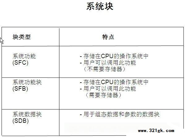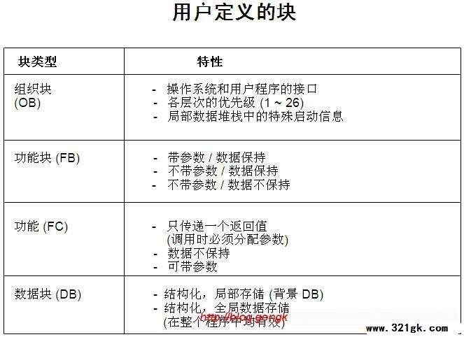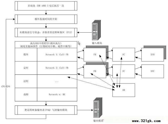 1.循环程序如何执行 1.1在CPU上电之后,启动块OB100/101/102先启动一次。(调用哪一个OB块由系统的启动模式配置决定) 1.2启动块执行完毕后,系统的循环监视时间就被激活了(这个时间可以在STEP7的硬件配置中设置,如果循环时间超出则PLC停机) 1.3之后,CPU会从输入模块及其它过程映象设备读取所有的输入状态 1.4接着下来便到了主循环程序的执行 1.4.1主循环执行也是按照语句顺序执行,如图所示,当OB1执行第一个语句CallFB,则此时程序进入所调用FB块顺序执行FB块的语句 1.4.2若在所调用的FB块,在某一语句中执行了CallFB/FC,则程序又进入下一级的FC中依次执行块中语句,依此类推 1.4.3当调用的下一级FC所有语句执行完成后,程序回到CallFC的这一语句,继续执行后面的语句 1.4.4当所Call的FB也执行完成后,程序回到OB1的CallFB处,继续执行后面的语句。 1.4.5直至最后,完成OB1的所有程序,则主循环结束。 1.4.6在OB1执行的过程中,循环中断(如OB35)、故障中断(如OB86)等可以插入执行,执行完成后会回到中断的地方继续主循环的执行。 1.5主循环执行完成后,PLC将过程映象的输出写到输出模块 1.6完成1.5的步骤之后一个完整的循环就结束了,此时跳至1.2步骤,重新开始新一循环的监视时间,如此周而复始。 ![]() 西门子plc程序执行图(建议保存) 2.程序块类型 知道了PLC循环程序如何执行后,我们再来看一看STEP7的程序块有哪些类型 2.1用户块 用户块包括程序代码和用户数据。在结构化程序中,一些块循环调用处理,一些块需要时才调用。 ![]() 2.1.1组织块 OB块构成了S7CPU和用户程序的接口。可以把全部程序存在OB1中,让它连续不断地循环处理。也可以把程序放在不同的块中,用OB1在需要的时候调用这些程序块。除OB1外。操作系统根据不同的事件可以调用其他的OB块,例如: 2.1.1.1时间-日期中断 2.1.1.2周期时间中断 2.1.1.3诊断中断 2.1.1.4硬件中断 2.1.1.5故障处理中断 2.1.1.6硬件启动 2.1.2功能块(FB) 功能块是在逻辑操作块内的功能或功能组,在操作块内分配有存储器,并存储有变量。FB需要这个背景数据块形式的辅助存储器。通过背景数据块传递参数,而且,一些局部参数也保存在此区。其他的临时变量存在局部堆栈中。保存在背景数据块内的数据,当功能块关闭时数据仍保持。而保存在局部堆栈中的数据不能保存。 2.1.3功能(FC) 功能是类似于功能块的逻辑操作块,但是,其中不分配存储区。FC不需要背景数据块。临时变量保存在局部堆栈中,直到功能结束。当FC执行结束时,使用的变量要丢失。 2.1.4数据块(DB) 数据块是一个永久分配的区域,其中保存其他功能的数据或信息。数据块是可读/写区,并做为用户程序的一部分转入CPU。 2.2系统块 系统块是在CPU操作系统中预先定义好的功能和功能块。这些块不占用用户程序空间。用户程序调用系统块,在整个系统中这些块具有相同的接口、相同的标示和相同的号。用户程序可以容易地转换到不同的CPU或PLC。 ![]() 2.2.1系统功能块(SFC) 系统功能是集成在S7CPU中的已经编程并调试过的功能。这些块支持的一些任务是设置模块参数、数据通讯和拷贝功能等。用户程序可以不用装载直接调用SFC。SFC不需要分配数据块。 2.2.2系统功能块(SFB) 系统功能块是S7CPU的集成功能。由于SFB是操作系统的一部分,用户程序可以不用装载直接调用SFB。SFB需要分配背景数据块DB,数据块必须作为用户程序的一部分下装到CPU。 2.2.3系统数据块(SDB) 系统数据块是由不同STEP7工具产生的程序存储区,其中存有操作控制器的必要数据。SDB中存有一些信息,例如:组态数据、通讯连接和参数。 3.编程方法 前面大致了解了一下PLC程序的一个循环是如何执行的,并了解了一下程序中块的类型,下面再来看看有哪些编程方法组织这些块。 每一个西门子的编程人员都会有自已的编程习惯和方法。STEP7为设计程序提供了三种方法。基于这些方法,可以选择最适合于你的应用的程序设计方法。 3.1线性化编程 所有的程序都在一个连续的指令块中。这种结构和PLC所代替的固定接线的继电器线路类似。系统按照顺序处理各个指令。 3.2模块化编程 程序分成不同的块,每个块包含了一些设备和任务的逻辑指令。组织块中的指令决定是否调用有关的控制程序模块。例如,一个模块程序包含有一个被控加工过程的各个操作模式。 3.3结构化编程 结构化程序包含有带有参数的用户自定义的指令块。这些块可以设计成一般调用。实际的参数(输入和输出的地址)在调用时进行赋值。 (责任编辑:admin) |