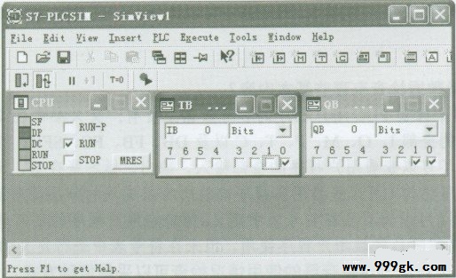 S7-PLCSIM应用窗口一经打开,S7-PLCSIM中的仿真CPU与STEP 7之间的连接即被自动建立。通常情况下,打开后的仿真PLC电源处于接通状态,CPU处于停止(STOP)模式,用户程序的扫描方式默认为“连续”扫描。