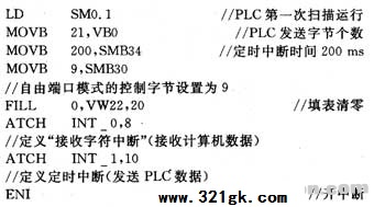 西门子S7-200plc由于其体积小,可靠性高,通讯功能强大等特点,在工业控制领域得到广泛的应用,使用S7-200PLC高性价比的自由口通讯协议实现人机界面灵活方便。目前S7-200PLC接收计算机指令数据主要有两种方法:第一种方法是使用PLC自带的RCV指令来接收计算机数据;第二种方法采用PLC提供的“接收字符中断”方式,将SMB2(自由口接收字符缓冲区)定义指针,使用指针接收数据。 使用“RCV"指令接收数据的方法虽然简单,但在接收大量数据的时候每次都要依次接收,大大降低了数据传输效率。在本实验室的一套机电一体化控制系统中,人机界面设计要求是:界面可以向PLC写入QB0、QB1、QB2、传感器采样周期、一个判断指令、AQ0、AQ1等不同指令数据。若一次上位机写指令仅仅是控制QB0.3的启动,为了写入QB0则需要将9 B的数据全部发送,由于PLC内接收数据是用“RCV”指令,必须将9 B的数据依次存储,这样会造成数据传输线路中的时间过长产生延时,降低数据传输的效率,甚至导致误码出现,显然这种使用“RCV”接收大量数据的方法不太适合。 使用PLC提供的“接收字符中断”方式,将SMB2(自由口接收字符缓冲区)定义指针,使用指针接收数据。此方法若仅仅定义一个指针,其效果和“RCV”指令是一样的。但此方法由于其使用起来比较灵活,故本文设计了一种多地址指针接收数据的方法,即在计算机向PLC写入数据时,仅写入指针判别的代号和对应数据就可完成上位机对下位机的写指令,不同的代号对应不同的地址,与以往使用“RCV”指令相比,有效地减少了写指令的数据,提高了通讯效率。本文在设计PLC与上位机的串口通讯中设计了此种方案,尚未见其他同类文章使用。 2 指针判别