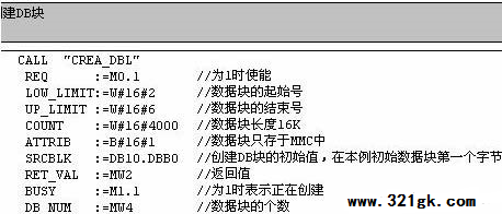 这样M0.1 为1 时,将在MMC 中创建DB2,3,4,5,6。每个DB 块容量为16K ,当MW4 等于5 时,完成创建工作,用户应复位M0.1。