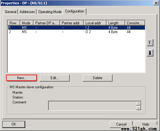 为了使300CPU能够与H系统进行通讯,应在300CPU内组态相应的与H系统的通讯区域。实际上是在300CPU的I/O区域内申请相应的通讯区域。I 区对应于从H系统接受的数据,Q区对应于向H系统发送的数据,点击Configuration页面,进行相应输入输出映象区设置,此处组态了4字节输入、4字节输出,见Pic4所示。