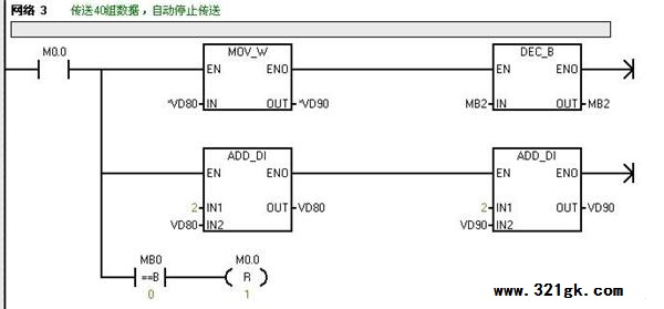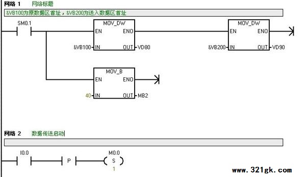 程序说明:该程序是将首址为VB100的数据区的40组数据依次传送到以VB200为首址的另一数据区里。I0.0为数据传送命令。