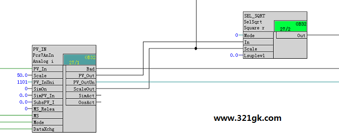测试时,可以先把需要仿真的数据填好,例如上图的功能块需要输出60,则在SimPV_In管脚输入60,然后再把SimOn置1 功能块互联管脚 选中一个功能块的管脚