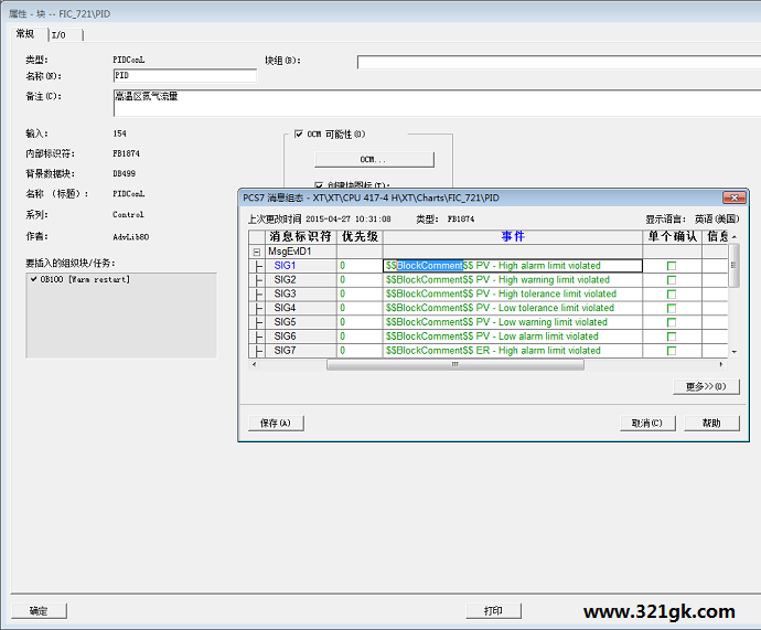 1.项目分析 工程技术人员首先要对工程项目进行分析,即项目工程的控制流程和每个流程的控制类型,并对整个项目可能出现问题做出预判。 (1)分析控制流程。分析控制流程时,建议绘制相关的控制流程图,清晰的标注每一步工作的内容和到下一步的条件。 (2)分析控制类型和预估plc选型所需参数。一般PLC适用于四种控制类型,即顺序控制,过程控制,运动(或位置)控制和网络通信等。工程技术人员在分析控制要求后,根据绘制的控制流程图,将每个控制流程的控制类型进行分类,再根据项目的复杂程度将组合出控制类型,因此前期准确地分析每一步的控制类型,将有助于选型的准确和问题的预估。 在分析项目控制类型的同时,工程技术人员还要预估PLC选型所需要的重要参数值。如顺序控制中的I/O点数;若使用编码器,要根据编码器的参数计算其输出脉冲的频率值,进而换算成PLC高速计数的脉冲频率。再如,过程控制中模拟量数和模拟量精度、运动控制中PLC对于伺服驱动器反馈信号的响应速度和PLC高速脉冲输出的数量,以及在网络通信时,所选PLC是否支持相应的网络类型等参数。 2.预估可能出现的问题 对于可能出现问题的预估是工程分析中较难的环节。这不仅需要工程技术人员对现场的工作环境和整个项目控制难点能够较好地把握,还要对可能出现的突发情况和危险具有前期预判。 (1)设备工作环境的把握。工程人员需要对生产环境有较全面的认识。如纺织机械所处工作环境的空气湿度高、振动较大,所以设计PLC系统时要做好防震处理。又如建材加工厂的环境温度比较高,并且有很大的粉尘和较强的静电,因此工程技术人员要在保证电气控制柜通风良好的前提下,进一步做好防尘和除静电处理。 设备工作环境的把握不仅仅局限于物理的环境,随着PLC应用的深入,更需考虑人员因素。如设备操作人员的素质较低时,需要开发较为简练的设备操作界面。 (2)项目难点的预期。项目难点的预期其实就是对项目核心问题的把握。如喷气织机设备的控制核心就是如何快速有序地控制电磁阀,利用压缩空气的摩擦力来牵引纬纱穿过纺织梭,完成纺织的引纬工作,这需要PLC具有非常快的响应速度。在确定项目难点后,工程技术人员可以根据难点来对PLC进行选型。从整个项目的角度出发,项目的难点就是系统设计的特点,也是PLC选型的方向。 (3)项目危险的前期预估。在项目设计前期,工程技术人员需对本项目可能出现的危险情况进行预判。如顺序控制或运动控制中调试设备时对于误动作的防护;在过程控制中,测试时是否有高压,高温或者有毒有害物质以及相关的防护措施。在项目设计前期对危险进行预估有助于加强工程技术人员的安全意识。 PCS7功能块使用说明 F1帮助使用 选中功能块然后按F1弹出帮助窗口