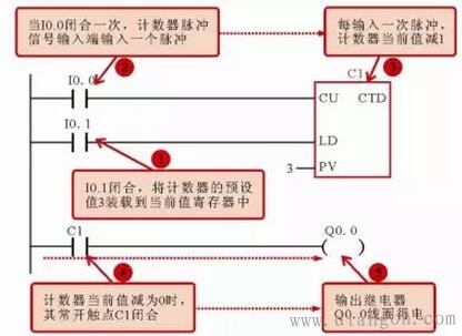 ②减计数器(CTD)的标注。减计数器(CTD)是指在计数过程中,将预设值装入计数器当前值寄存器,当计数端输入一个脉冲式时,当前值减1,当计数器的当前值等于0时,计数器相应触点动作(常开触点闭合、常闭触点断开),并停止计数。