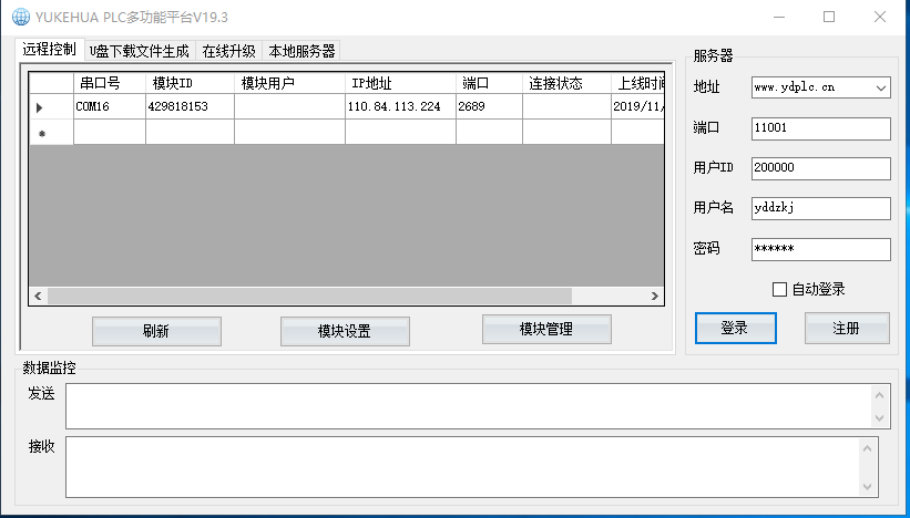 2、用户向誉达电子提出申请,誉达电子会分配一个ID号给该用户, 默认用户名:123456。密码:123456。可以自己修改用户名及密码。 3、返回主界面,点击模块管理,进入如下界面: