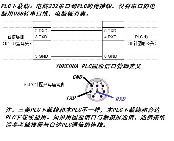 2个RS232(8芯通信口为FX3u协议38400,7,E,1;白色通信口通信协议可通过设定D8126变换,可切换为FX3u、Modbus Rtu、RS指令),1个RS485(通信协议可通过设定D8120改变,可改为FX3u协议或Modbus Rtu协议、RS指令以及变频控制指令)。1个CAN总线,用于连接远程IO模块或主机间自动通信。1个USB口用于程序下载,在线监控。