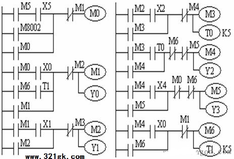 人靠近自动门时,感应器X0为ON,Y0驱动电动机高速开门,碰到开门减速开关X1时,变为低速开门。碰到开门极限开关X2时电动机停转,开始延时。若在0.5s内感应器检测到无人,Y2起动电动机高速关门。碰到关门减速开关X4时,改为低速关门,碰到关门极限开关X5时电动机停转。在关门期间若感应器检测到有人,停止关门,T1延时0.5s后自动转换为高速开门。