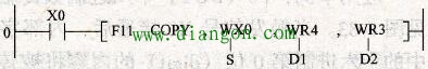 应用举例:F11 (COPY)块传输指令应用见图所示。当X0接通时,外部输入寄存器WX0(16位)的内容传输到WR4为首地址的区块WR0~WR3中。 ![]() 图 梯形图 指令功能:由D1和D2指定的16位数据的内容相互交换。 应用举例:F15 (XC H) 16位数据交换指令应用见图所示。当X0接通时,内部继电器WR0和数据寄存器DT3中的内容相互交换。 ![]() 图 梯形图 (责任编辑:admin) |